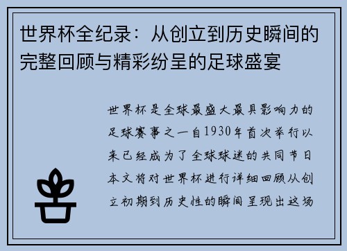 世界杯全纪录:从创立到历史瞬间的完整回顾与精彩纷呈的足球盛宴