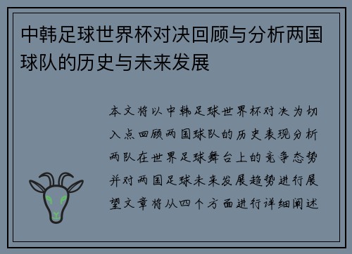 中韩足球世界杯对决回顾与分析两国球队的历史与未来发展